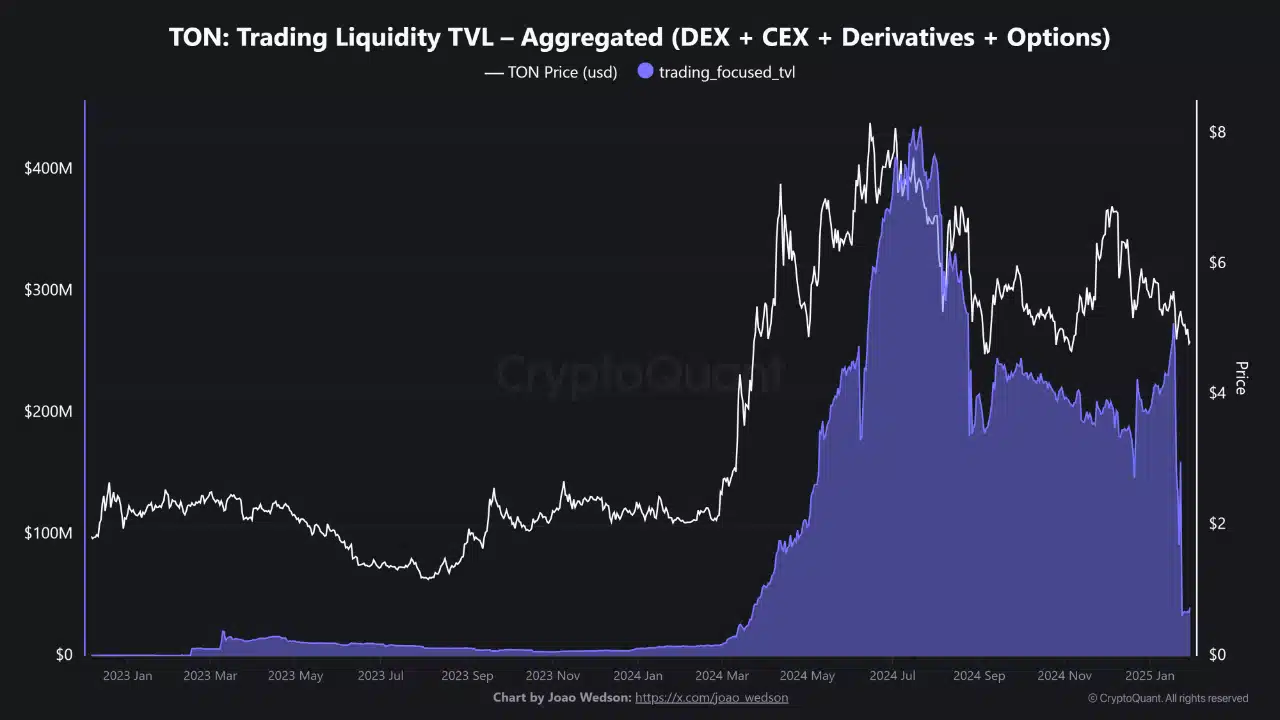 Toncoin [TON] saw a steady decline in its total value locked (TVL) across decentralized and centralized exchanges (DEX and CEX), as well as in derivatives and options. According to CryptoQuant analyst Joao Wedson, this may be a sign of de-leveraging.