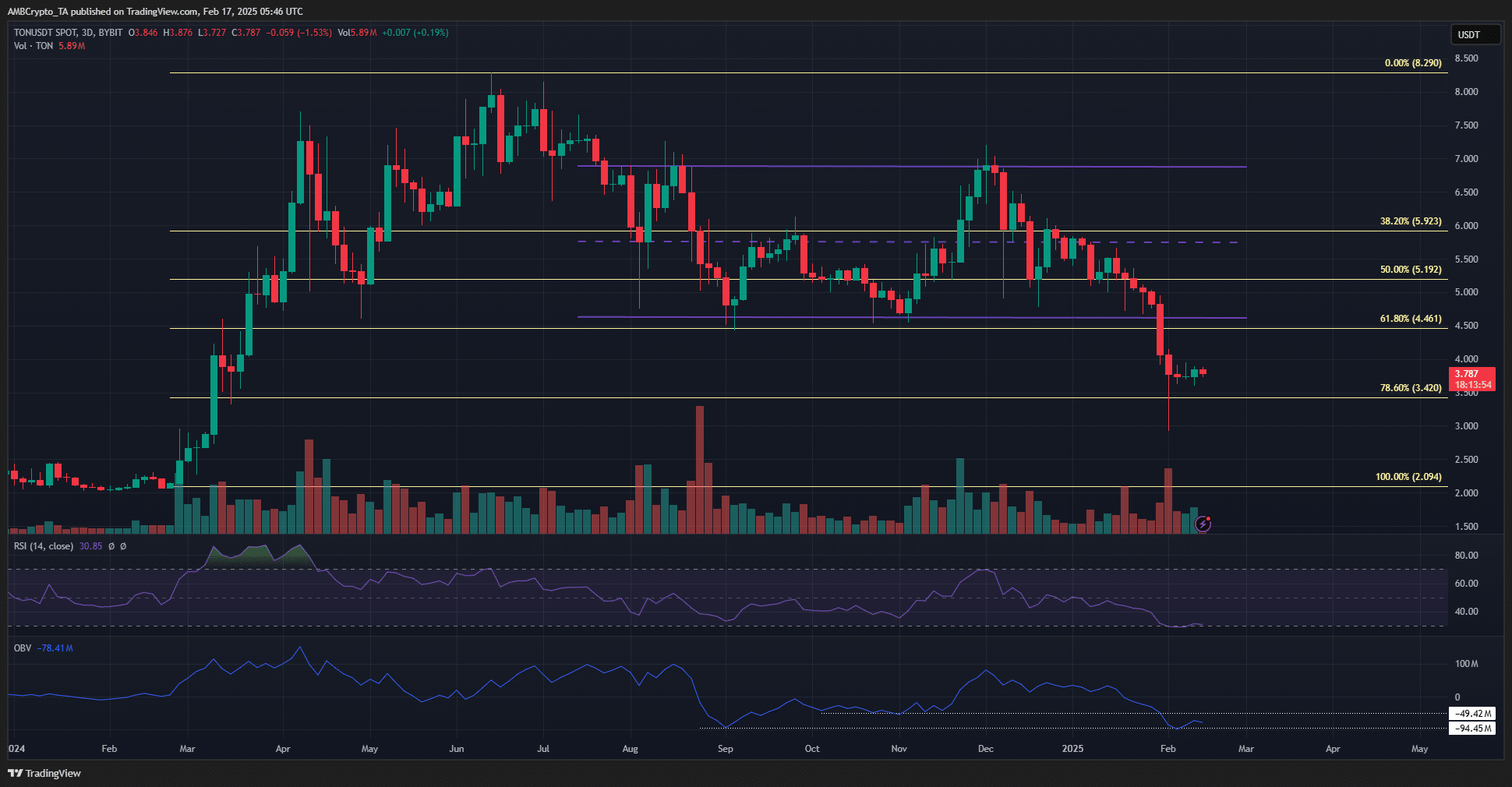 The OBV of Toncoin has sunk below November lows and is holding on to the September lows.