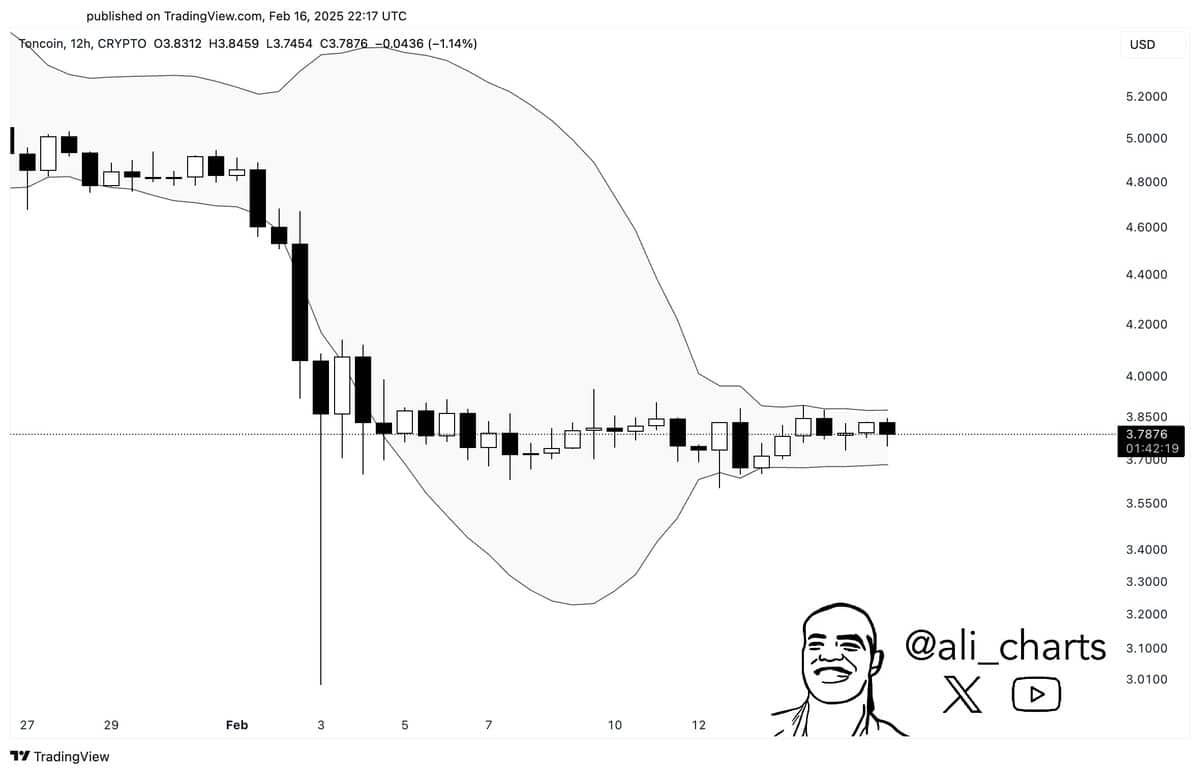 Toncoin [TON] has witnessed vastly reduced volatility in recent days. In a post on X (formerly Twitter), crypto analyst Ali Martinez noted that the Bollinger Bands were squeezing around the TON price on the 12-hour chart.