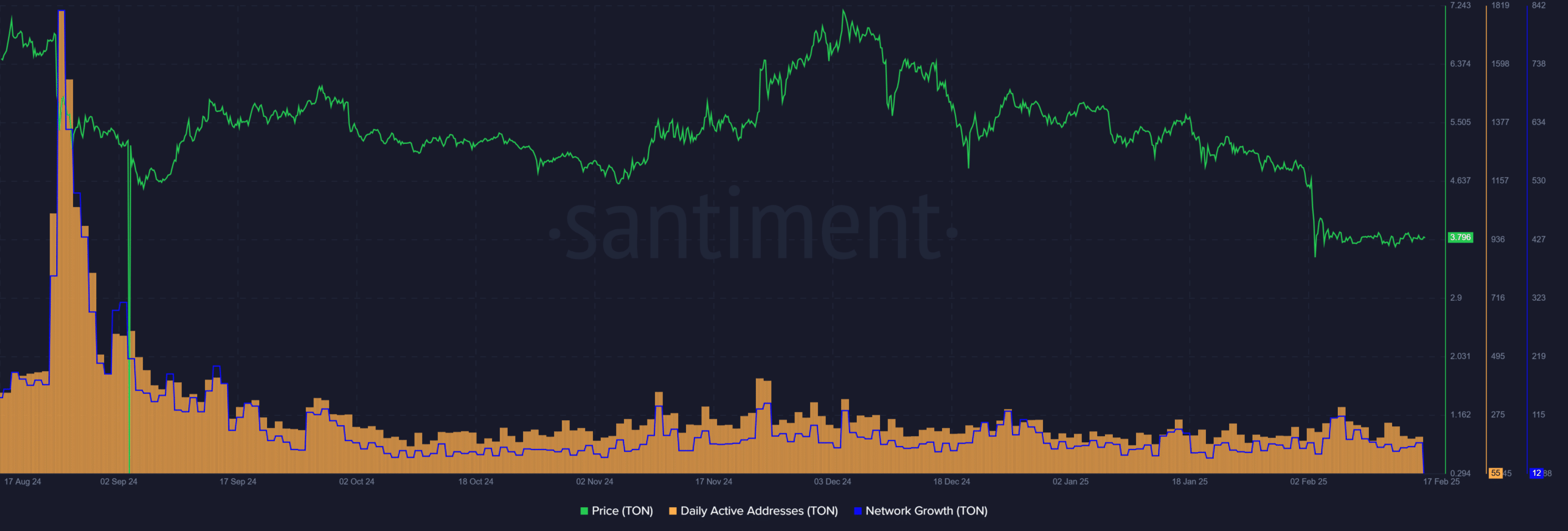 The Toncoin network’s daily active addresses saw a large peak back in August, when the price retraced from its rally past $7.5.