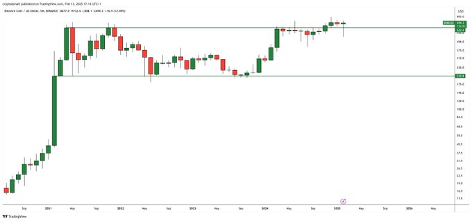 Turning to BNB, DonaAlt says that the sixth-largest crypto asset by market cap appears bullish on the monthly time frame after climbing above a range that started in early 2021.