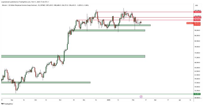 Next up is Bitcoin (BTC). The pseudonymous analyst says that Bitcoin is currently “struggling” and that the best entry opportunity for a long entry lies above $101,000. According to DonAlt, Bitcoin is right now trading in a “simple range” with the key support level at around $95,000 and the key resistance at around $101,000.