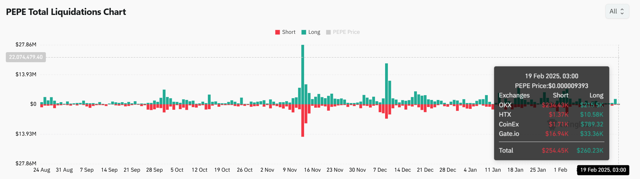 As of the 19th of February, PEPE’s total liquidations amounted to $514.68K, with $254.45K in short positions and $260.23K in long positions. This showed more long positions being liquidated, indicating that traders were betting on a price rise.
