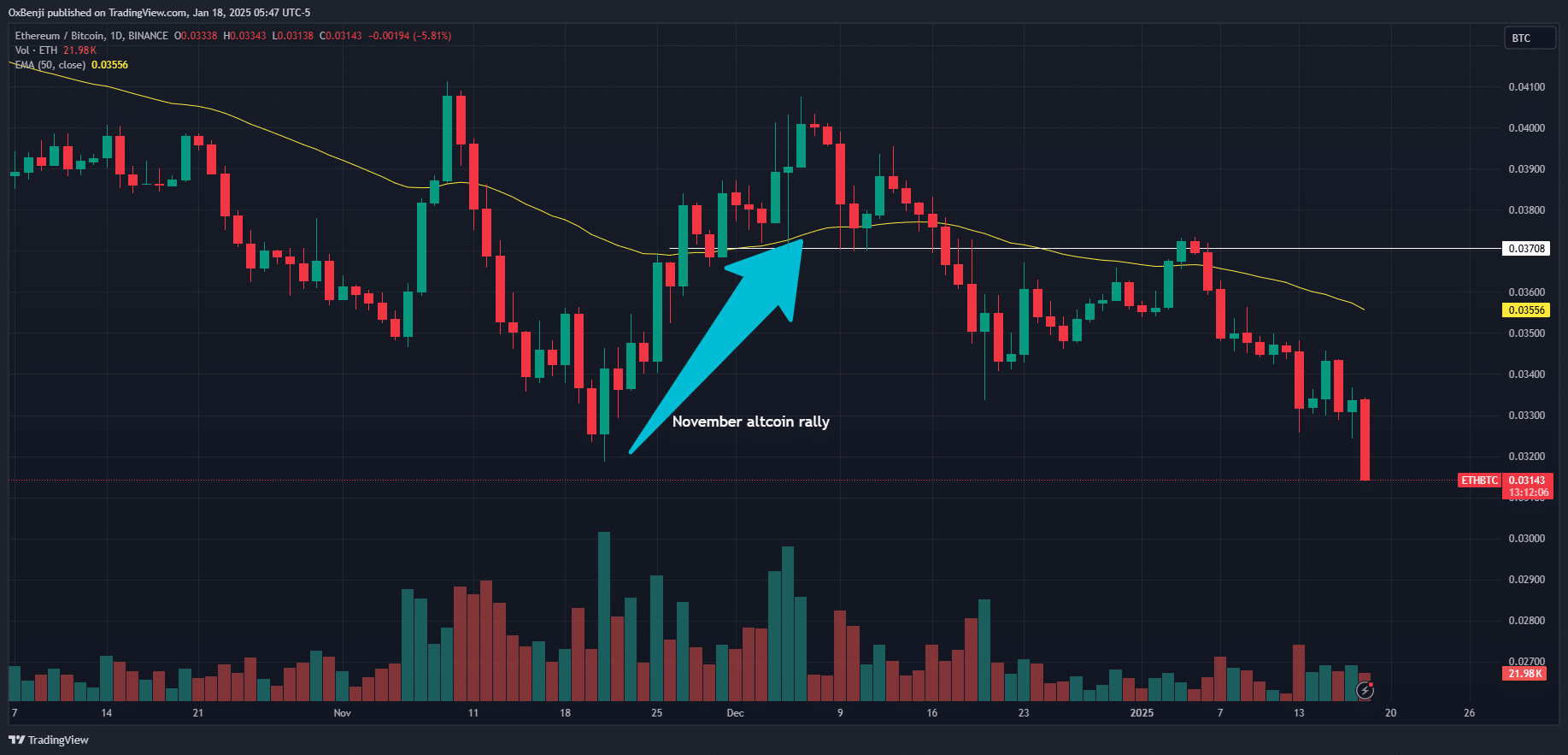 “Importantly for the long tail, $BTC dominance has been slowly fading since late November ’24 – fireworks if that continues.”