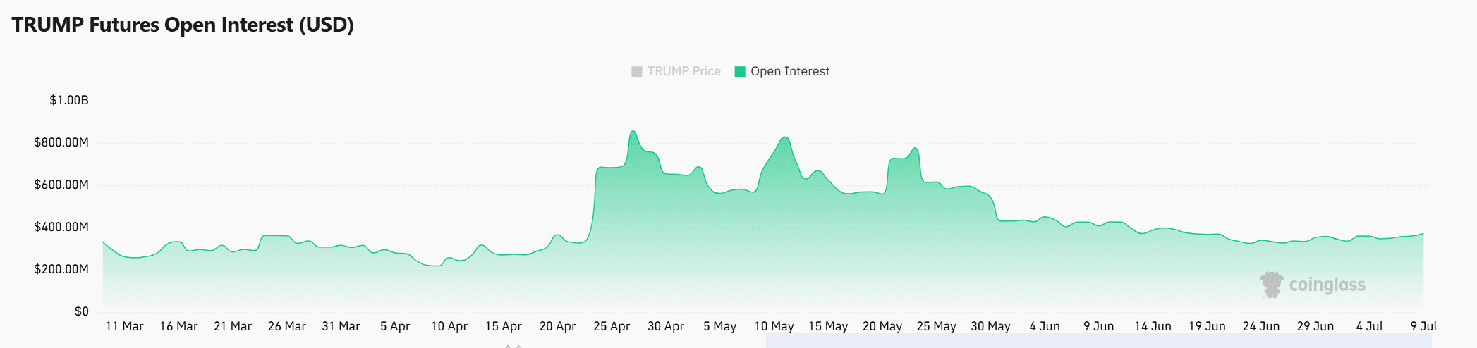 TRUMP’s derivatives market painted an ambiguous picture. Open Interest rose 5.79% to $376.78 million, while volume ticked up 3.51% to $348.79 million, at press time.