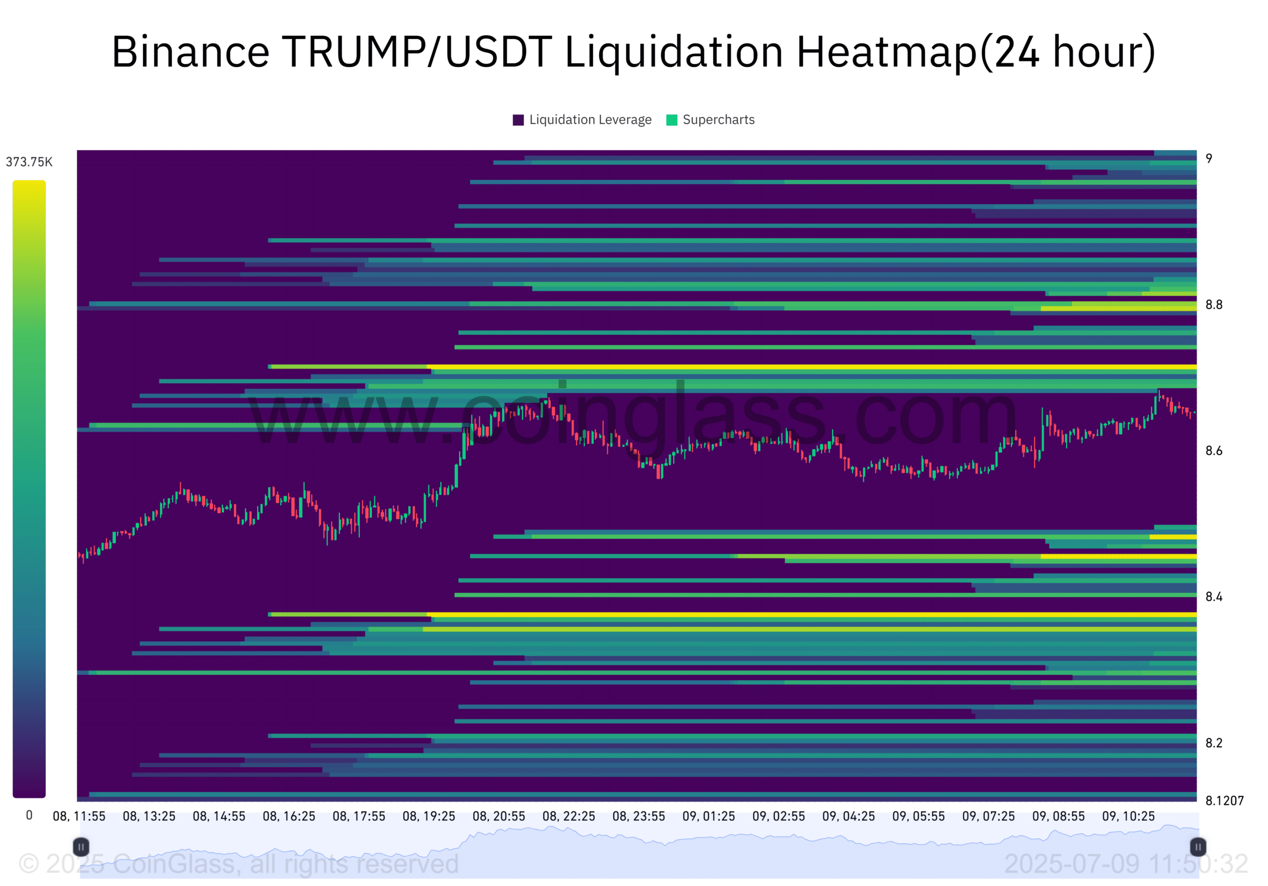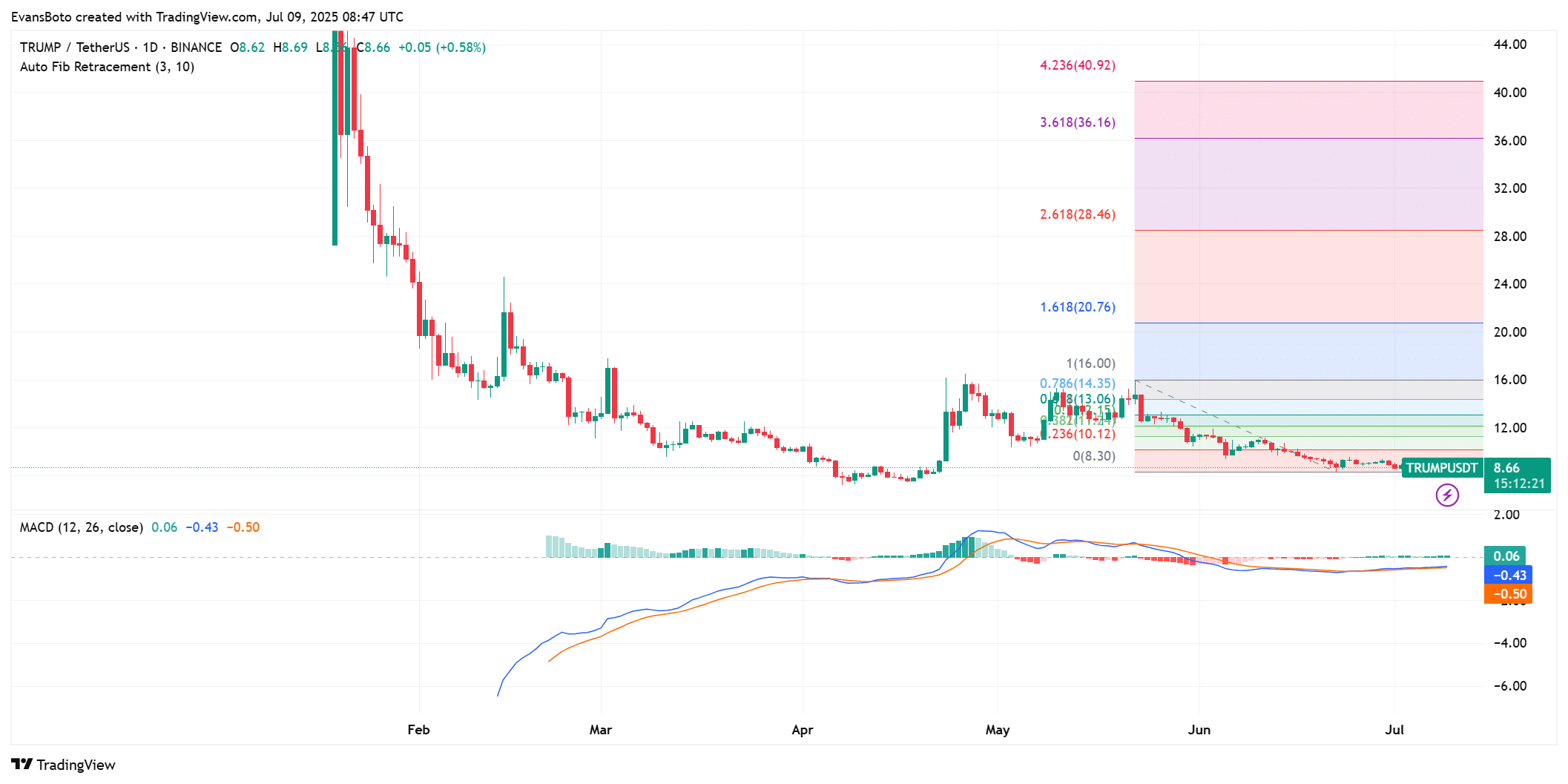 At the time of writing, TRUMP was consolidating near $8.66, above the $8.30 local low. According to Fib retracement levels, resistance was spotted ahead at $10.12, with tougher ceilings around $13.06 and $14.35.