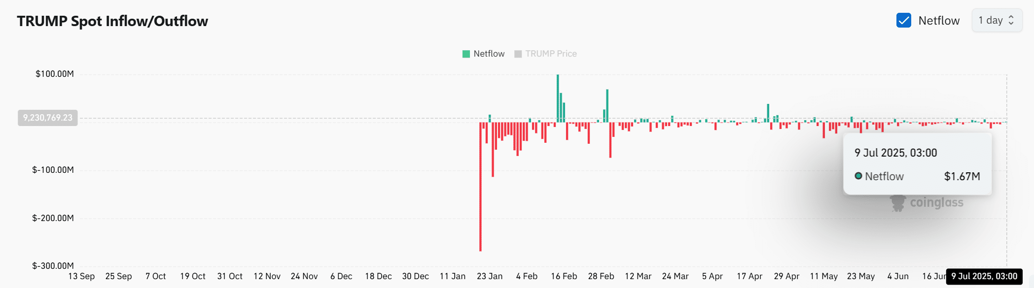At press time, TRUMP recorded $1.67 million in Net Inflows across major exchanges, based on CoinGlass data.