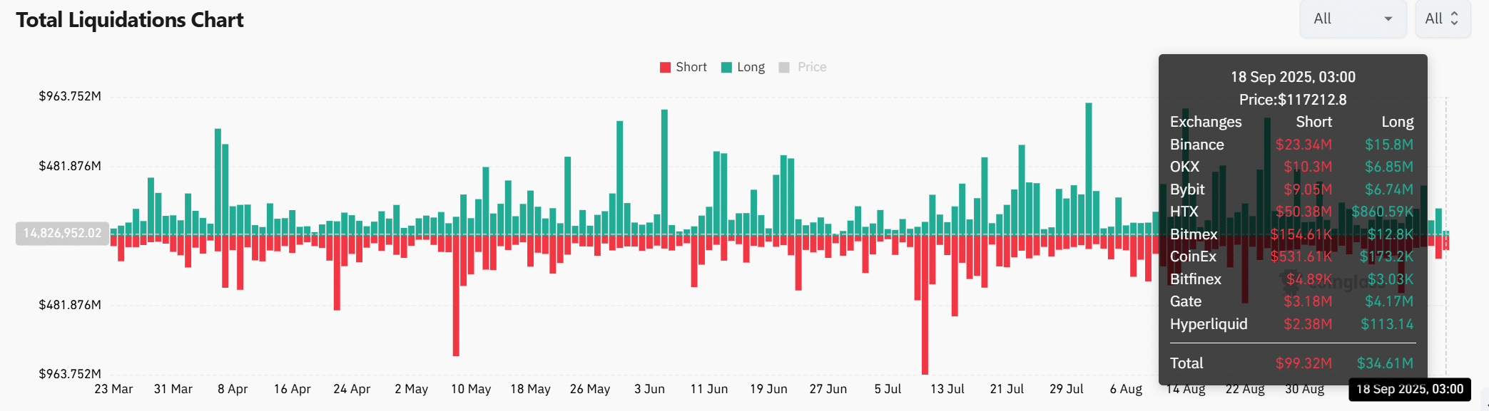 Recent liquidation data paints a telling picture of sentiment shifts. Over $99.32M in shorts were liquidated compared to $34.61M in longs, reflecting pressure on bears.