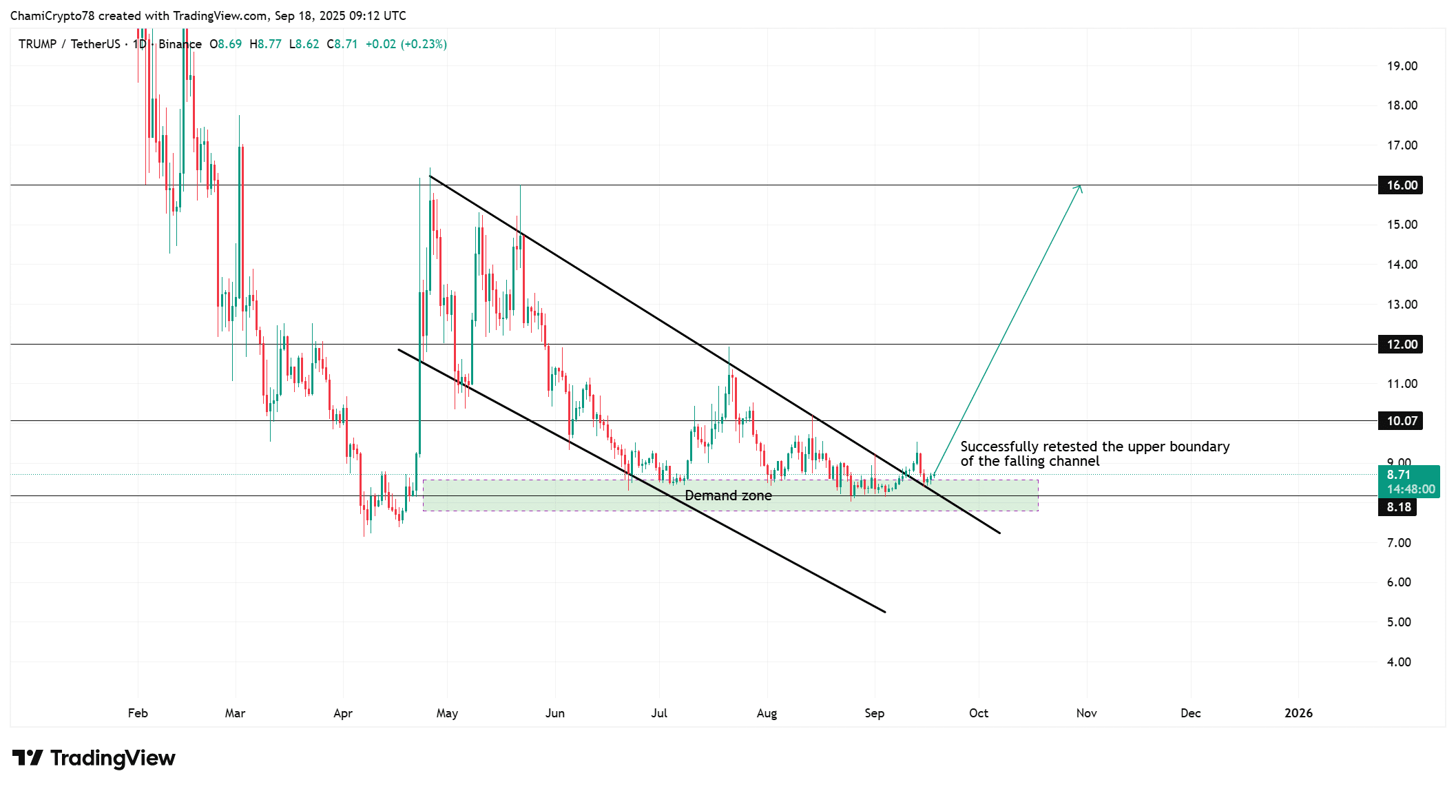TRUMP tested the upper boundary of its falling channel, a critical level that often signals breakout potential. Buyers concentrated demand around $8.18 to $8.70, creating strong support against downward pressure.
