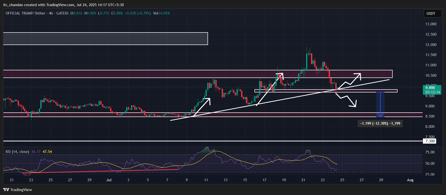 However, the price is currently showing signs of a reversal. If it holds above the $9.70 level, an upside rally could follow.