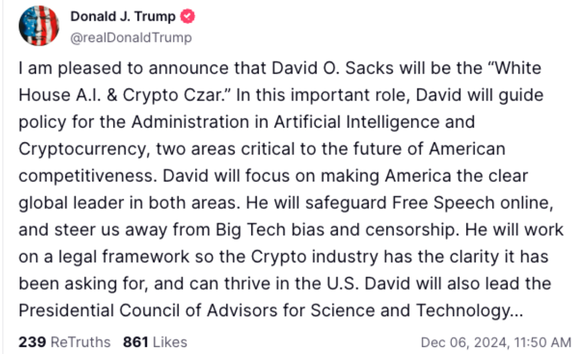 Sacks was appointed White House Crypto and AI and Czar on Dec. 6, 2024, to “work on a legal framework so the Crypto industry has the clarity it has been asking for, and can thrive in the U.S.,” Trump wrote in the announcement.