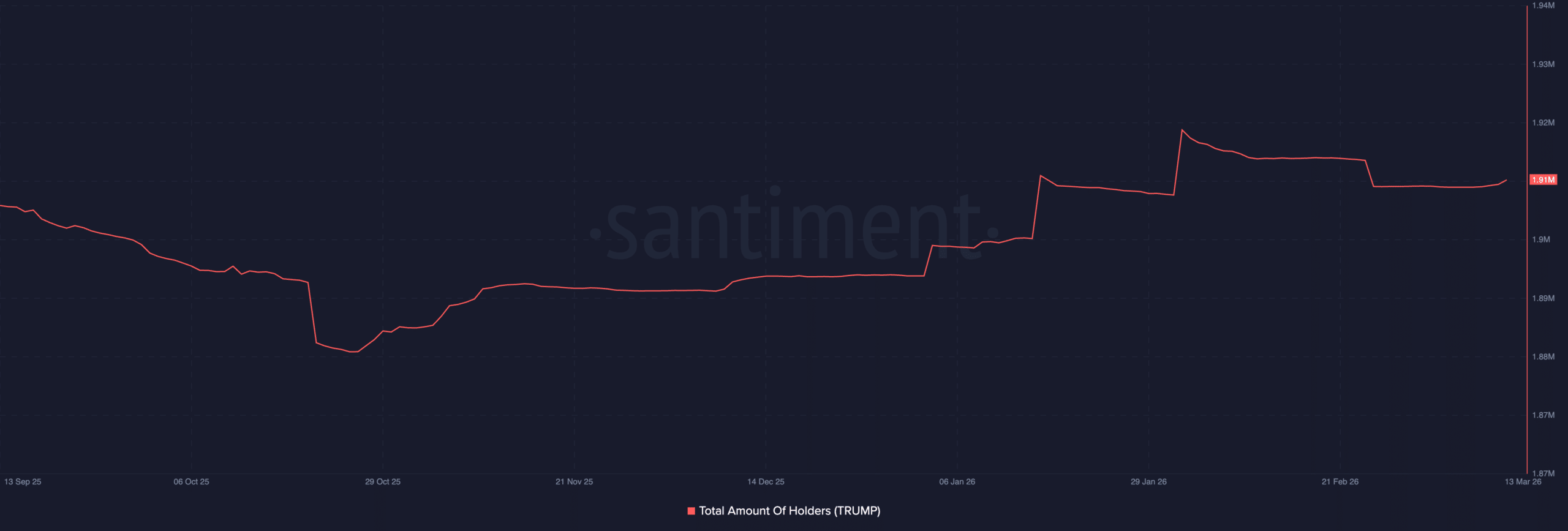 On-chain data from Santiment shows the number of TRUMP token holders has been gradually increasing, reaching approximately 1.91 million addresses.