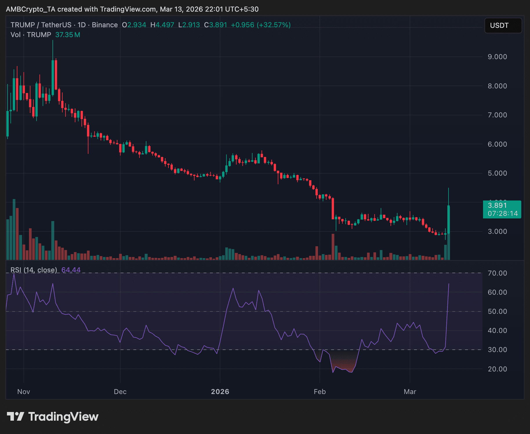 According to TradingView data, TRUMP climbed from around $2.93 to $3.89, marking one of its strongest daily moves in recent weeks.