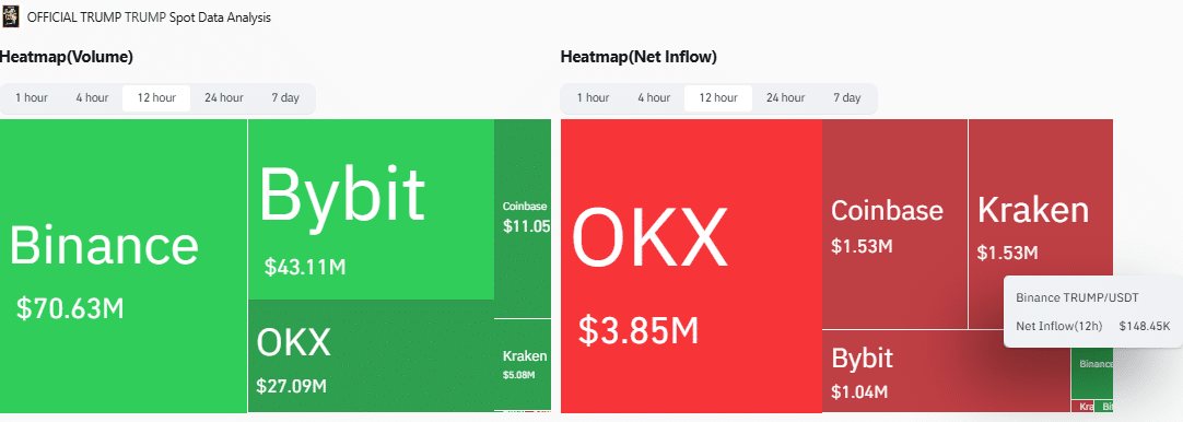 Spot flows and the volume heatmap highlighted TRUMP’s activity across cryptocurrency exchanges. Binance led with $70.63M in volume and $148.45K in 12-hour positive net inflows.