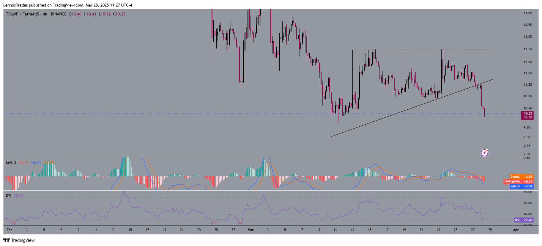 A 8% decline was seen on TRUMP/USDT’s charts when it penetrated through its ascending triangle support level which showed higher selling activities. The price position of $10.23 highlighted bearish continuation because the breakdown happened on the charts.