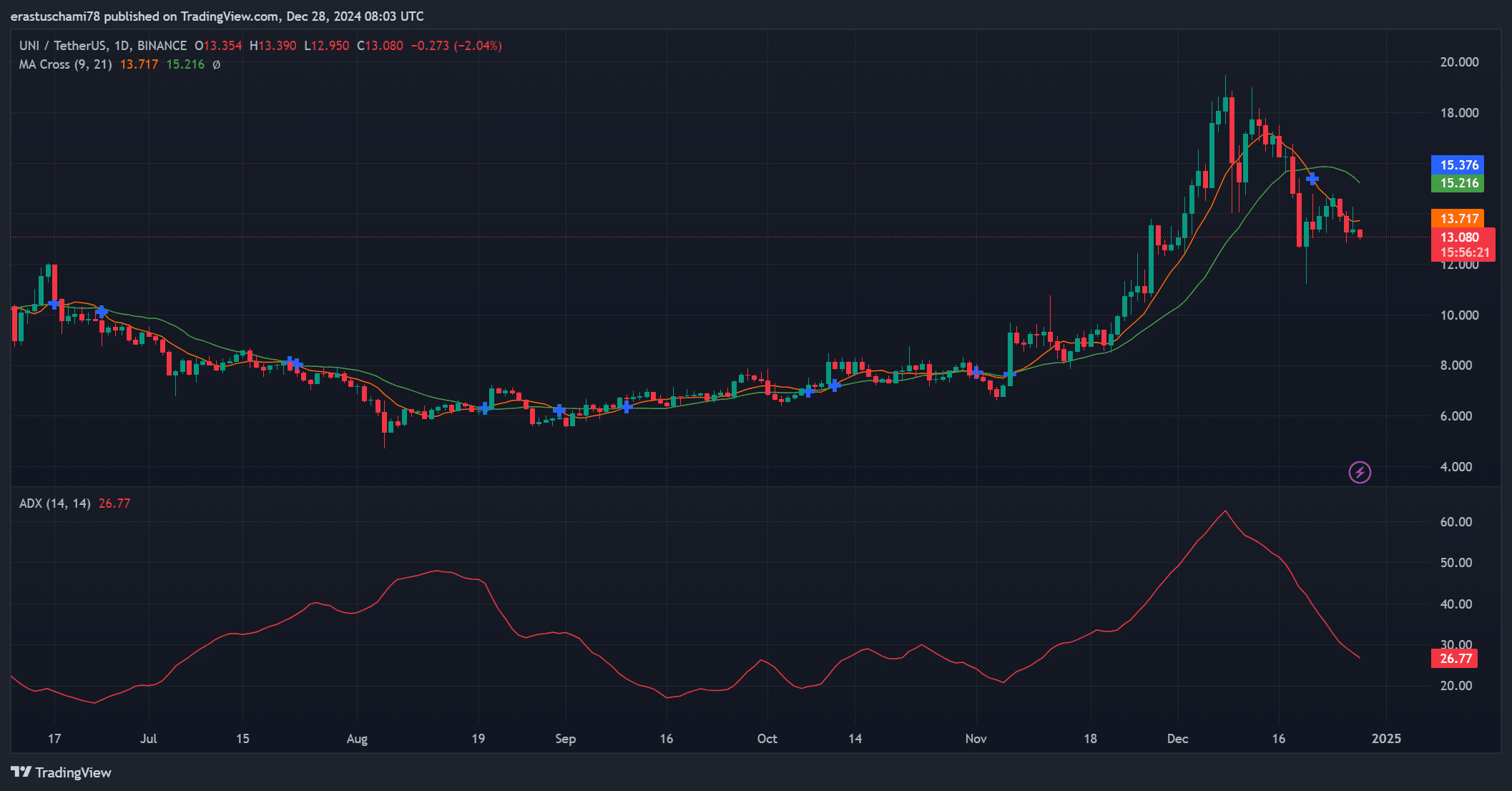 Meanwhile, a whale’s recent $1.42 million USDC purchase of 100,000 UNI at $14.24 highlighted strong investor confidence. At press time, UNI was trading at $13.07, with the altcoin down by 4.07% and key price levels likely to dictate its next direction.