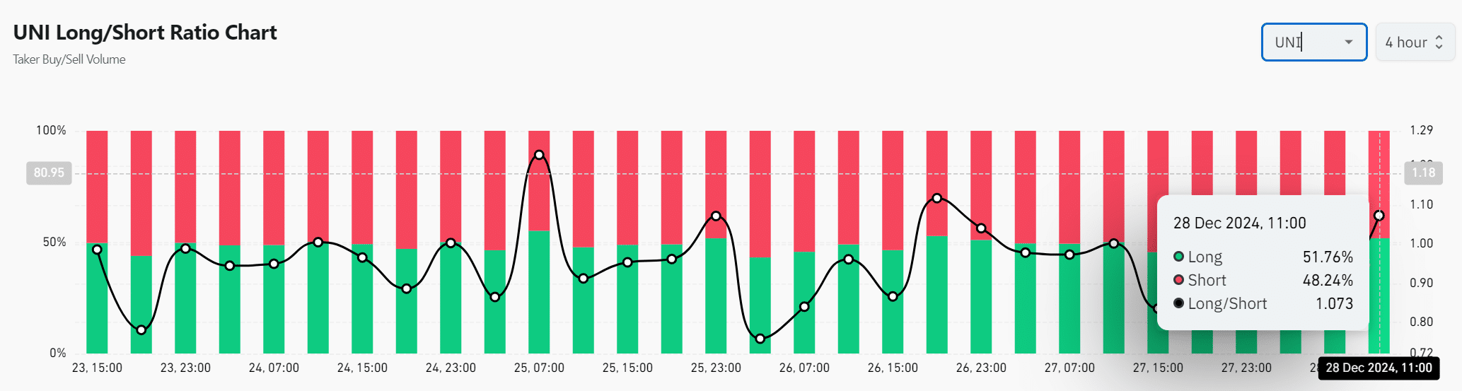 The long/short ratio for UNI stood at 1.073 at press time, with 51.76% of taker volume favoring longs. This growing bullish sentiment suggested that traders are positioning for a potential breakout. Additionally, the shift towards long positions aligned with broader expectations of upward price action.