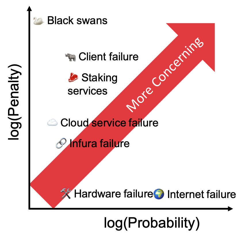 So let’s think through some failure cases and examine them through the lens of how many others would be affected at the same time, and how badly your validators would be punished.