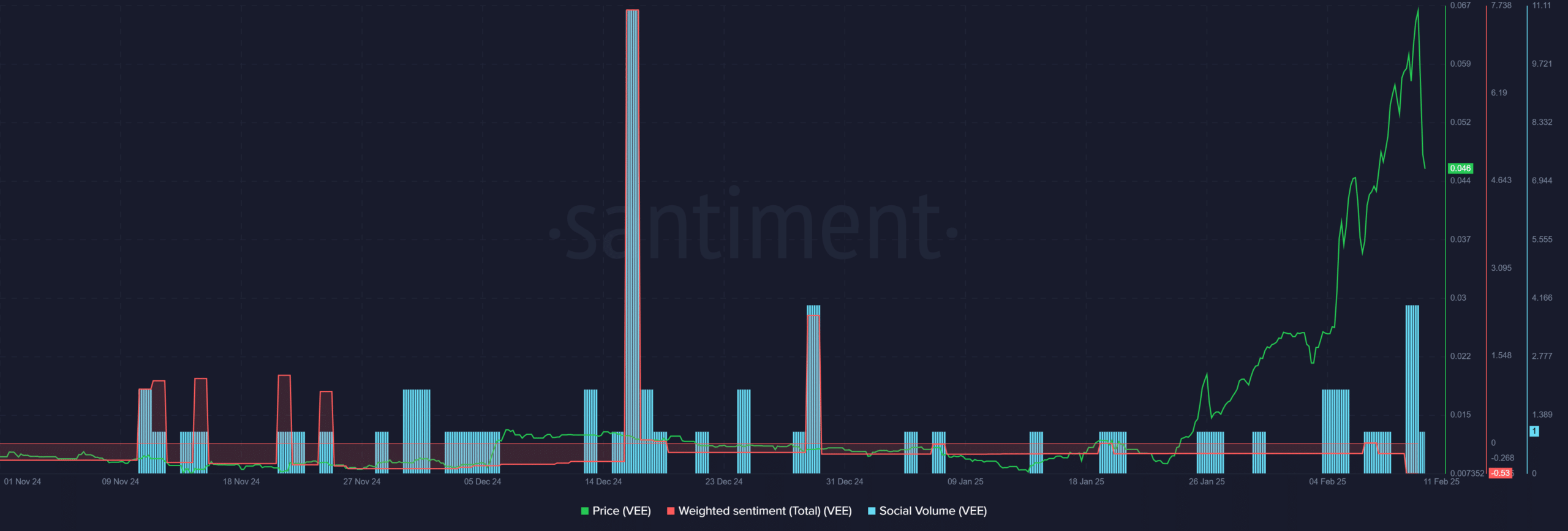 According to Santiment, social volume spiked, hinting at increased market interest across socials. However, the weighted sentiment flipped negative, which could hold back a strong rebound for VEE in the short term.