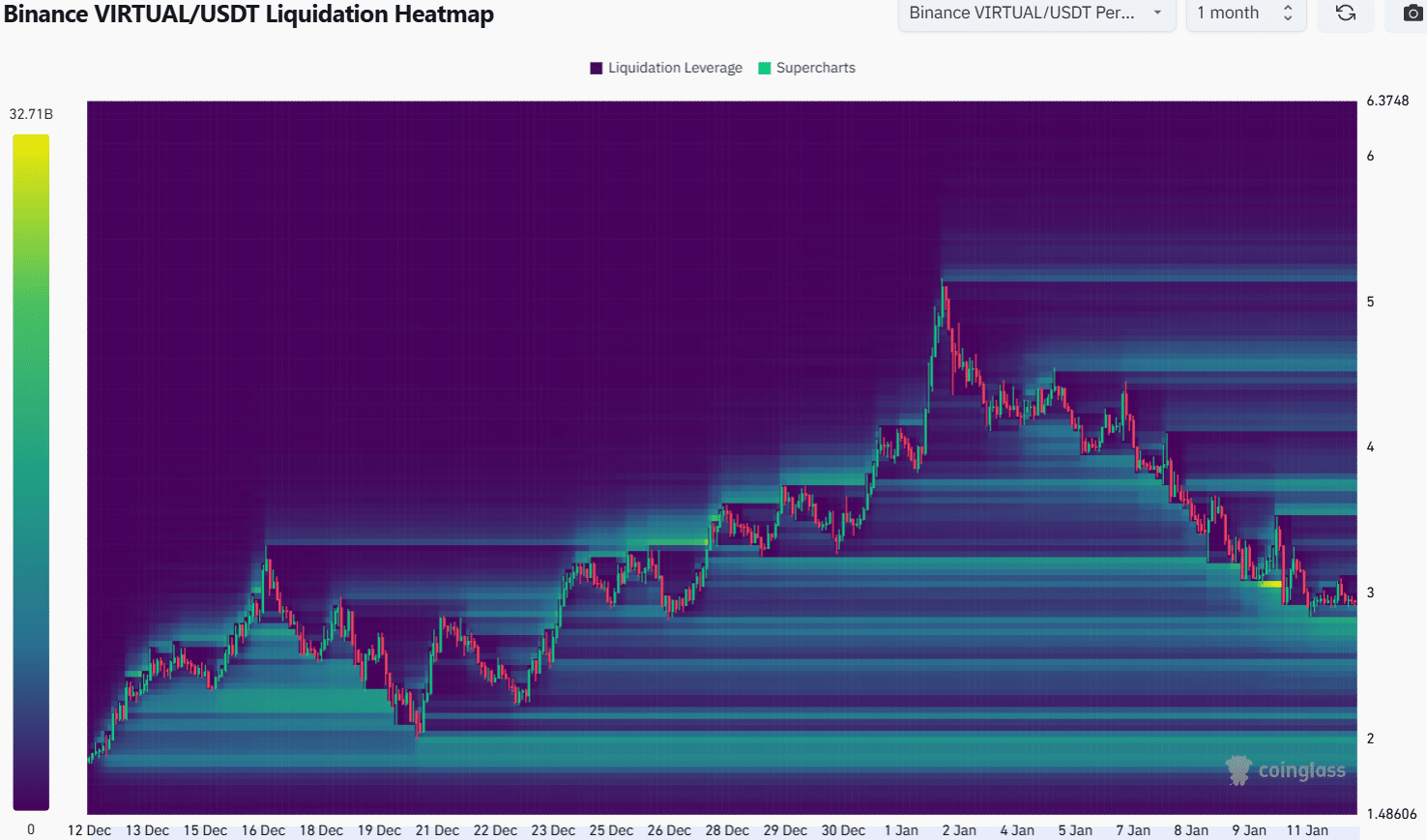 The price of the token has been falling lower each day since 02 January, with just two green days. While the trading volume was much reduced compared to the rally that took VIRTUAL to $5.25, the losses were still significant.
