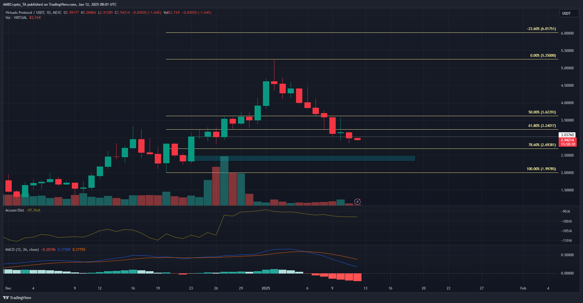 Virtuals Protocol [VIRTUAL] has not relinquished its long-term bullish outlook. And yet, the deep retracement from the all-time high at $5.25 is a worry for buyers. In fact, the psychological $3 level appeared ready to crumble in the face of seller momentum.