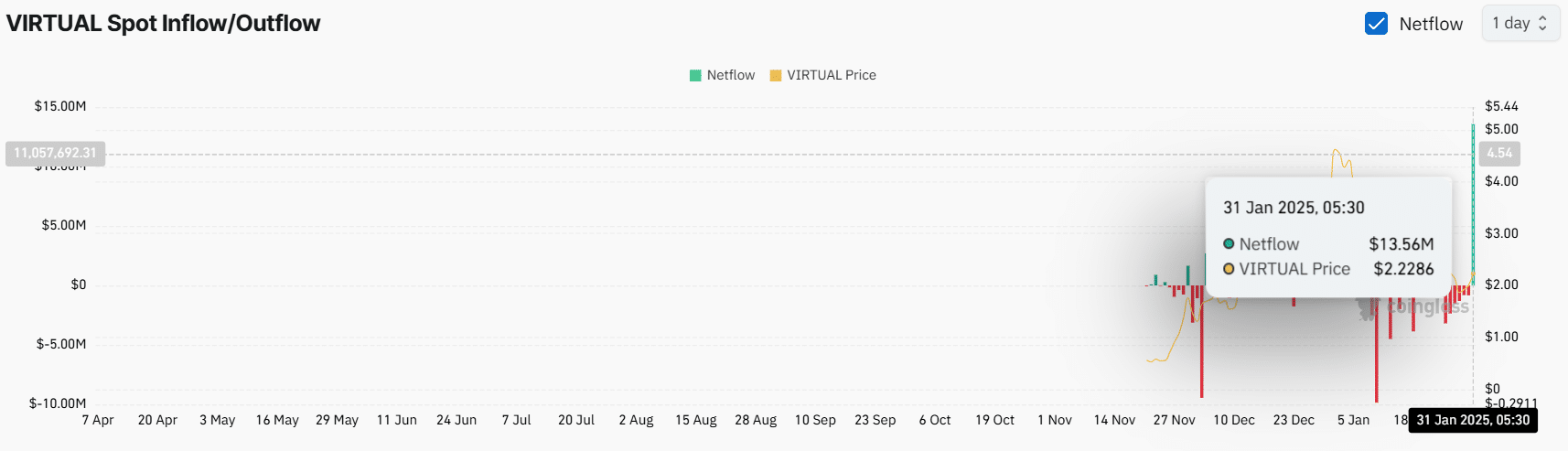 Data on spot inflows/outflows revealed that as the price of VIRTUAL skyrocketed, exchanges worldwide saw significant inflows of $13.5 million. This marked the highest recorded inflows since the token’s launch.