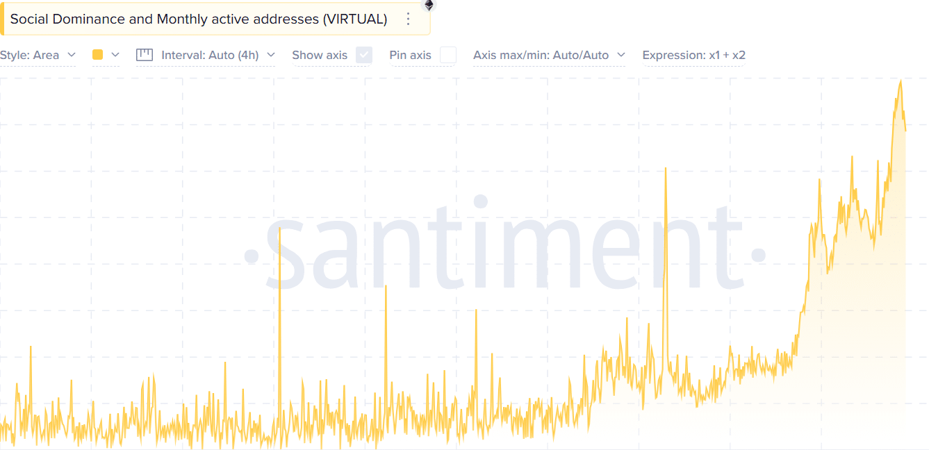 The combined social dominance and monthly active addresses of the Virtuals Protocol show a clear correlation. As social dominance spiked, reflecting heightened community interest, active addresses also rose.