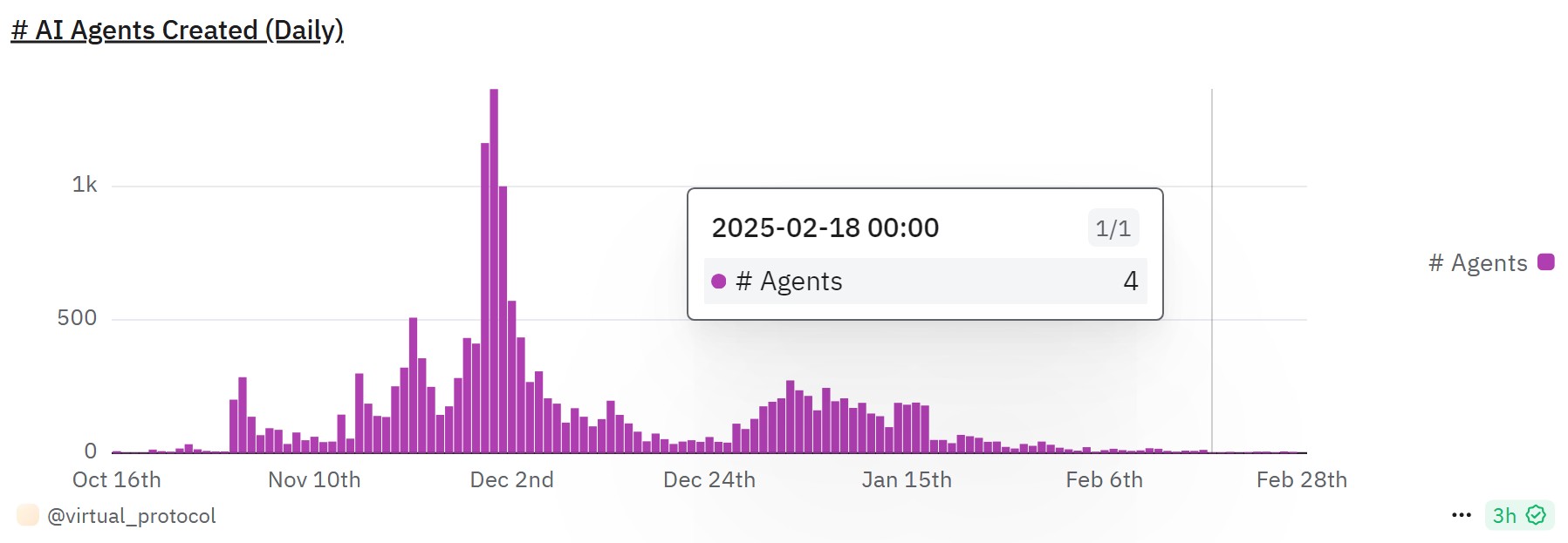 Virtuals has had less than 10 agents created since Feb. 18. Source: Dune Analytics