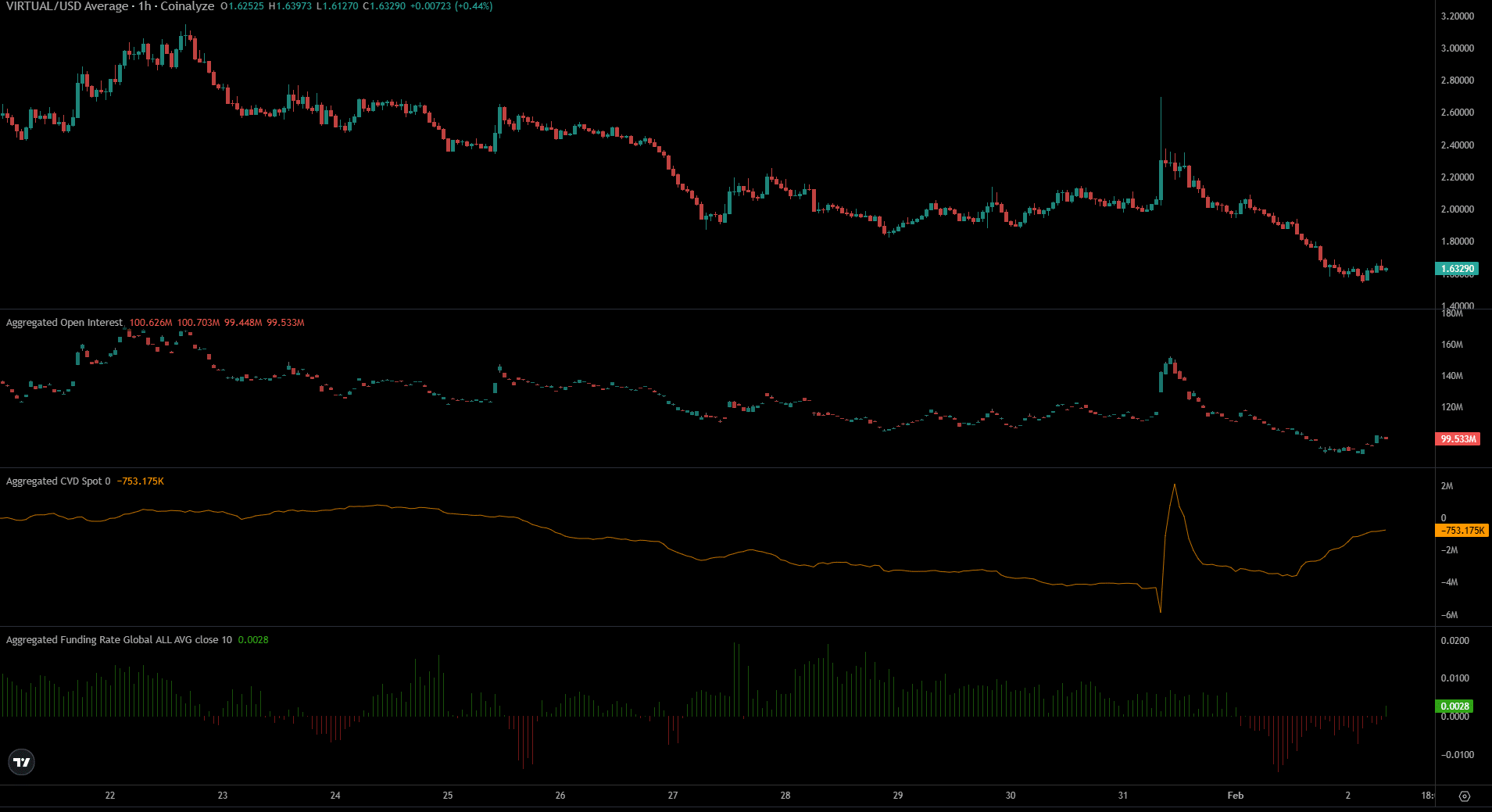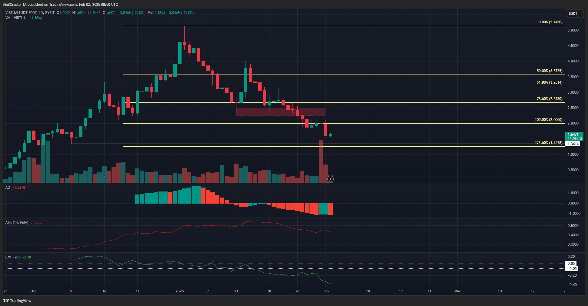 The high inflows of VIRTUAL into exchanges noted recently was a sign of a sell-off. The $2.5 resistance zone wasn’t overcome, and the short liquidations above this resistance zone were swept, paving the way for new lows.