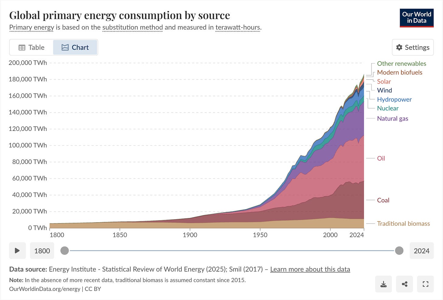 Regardless of which fighter you choose, all of the above will be required in some kind of particular mix. The least bullish avenue is traditional grid based energy delivery systems given the choke point there. Below is a chart of our current energy consumption trend and the sources that compromise it.