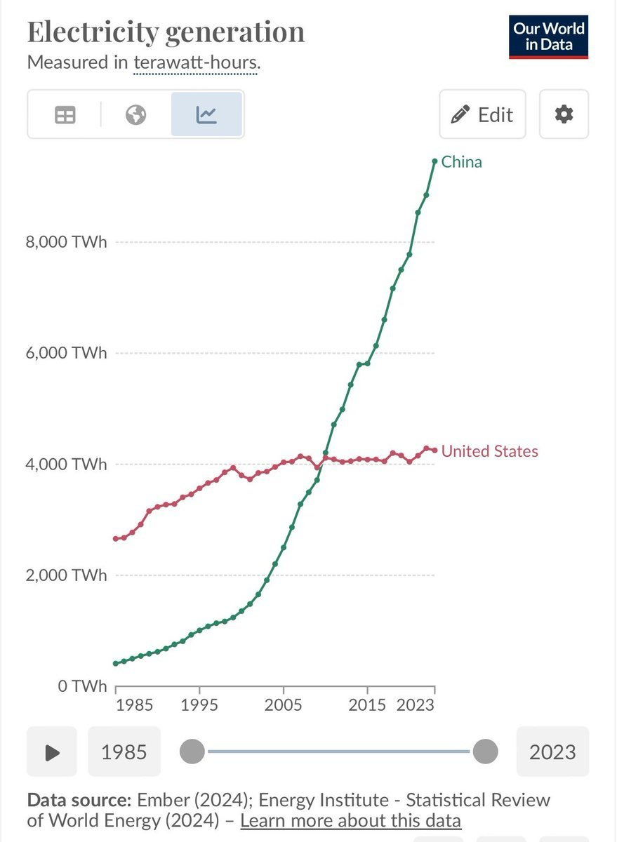 In case it isn’t clear, the future of energy generation lives in China, not the United States. Some will say that nuclear will come in and save us but there’s still a lot of challenges around it and time to deployment is still not very fast. Renewables like solar have low deployment time but of course have other complications (aka the sun is not always on so you need batteries/storage). Of course the question is whether the United States can “bend the curve” of electricity generation but there isn’t a lot of data to suggest so otherwise. Crusoe and other companies are doing some neat things in this area but it’s still to be seen!