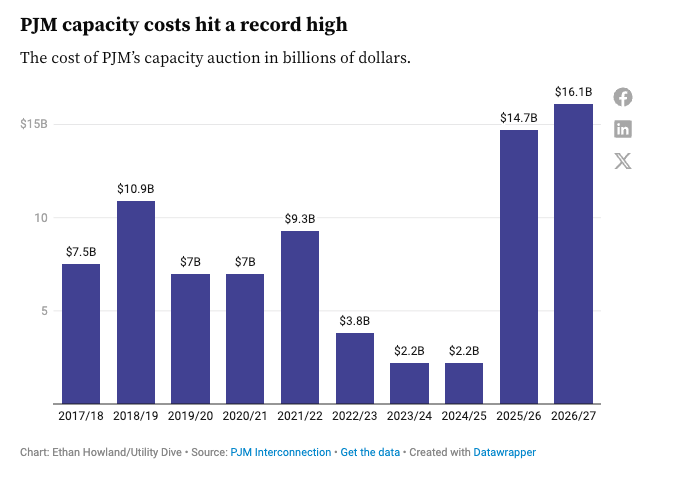Another interesting chart is the following: PJM, which is one of the largest grid operators in the country, has seen the cost of their capacity auctions skyrocket. Last year was the real jump and this year was 22%. However relative to prior years, it paints a very clear picture around where things are heading.