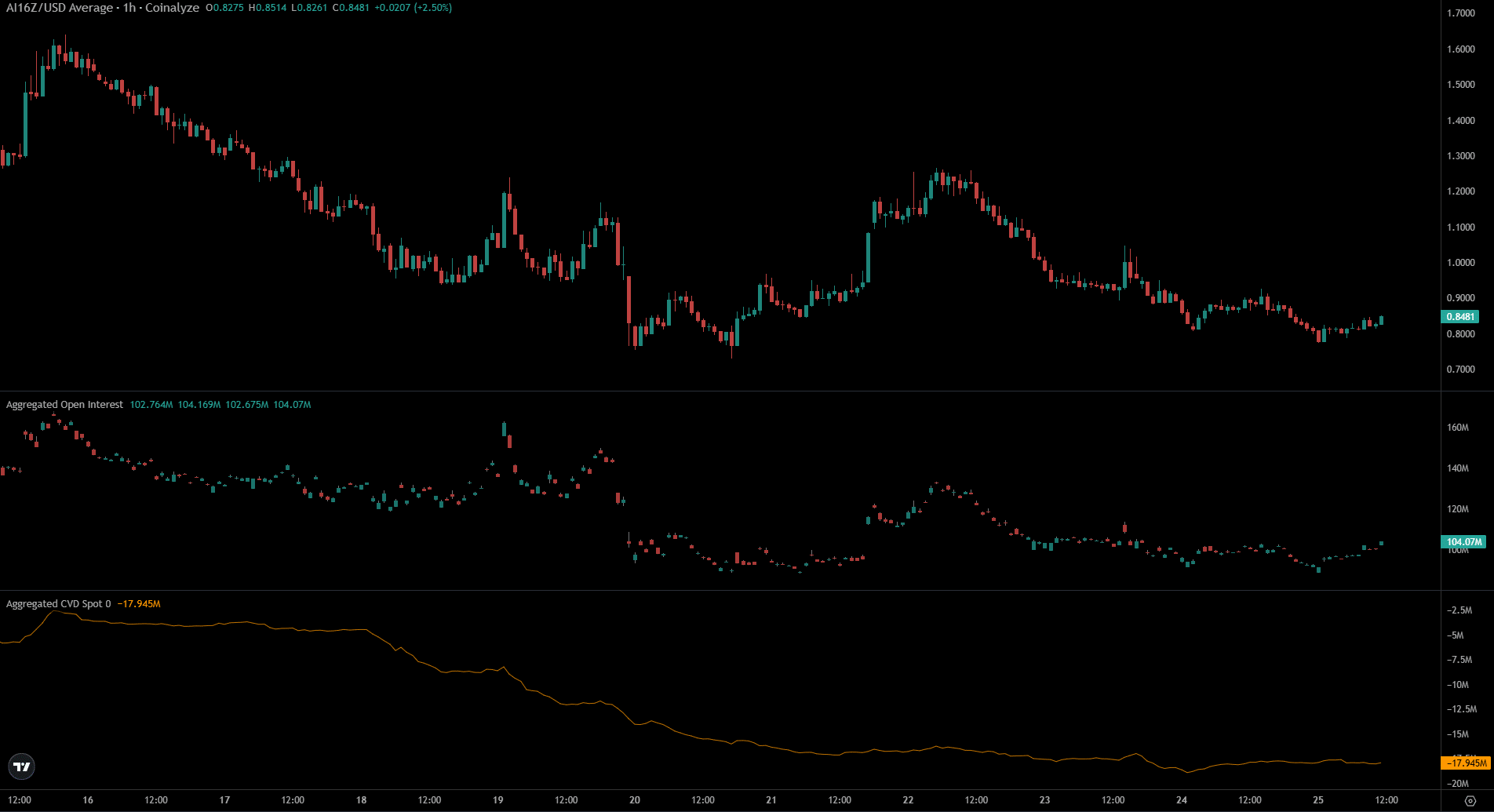 Finally, the Open Interest climbed by 3.4% over the last 24 hours, with most of that coming in recent hours when AI16Z bounced from its local lows. Despite the bounce, however, the spot CVD remained stagnant.