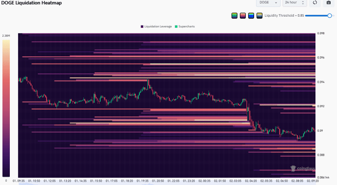 The liquidation heatmap showed that longs were being wiped out, amplifying the price drops. Only defending the $0.09 support level would reduce the long squeezes that are keeping DOGE under pressure.