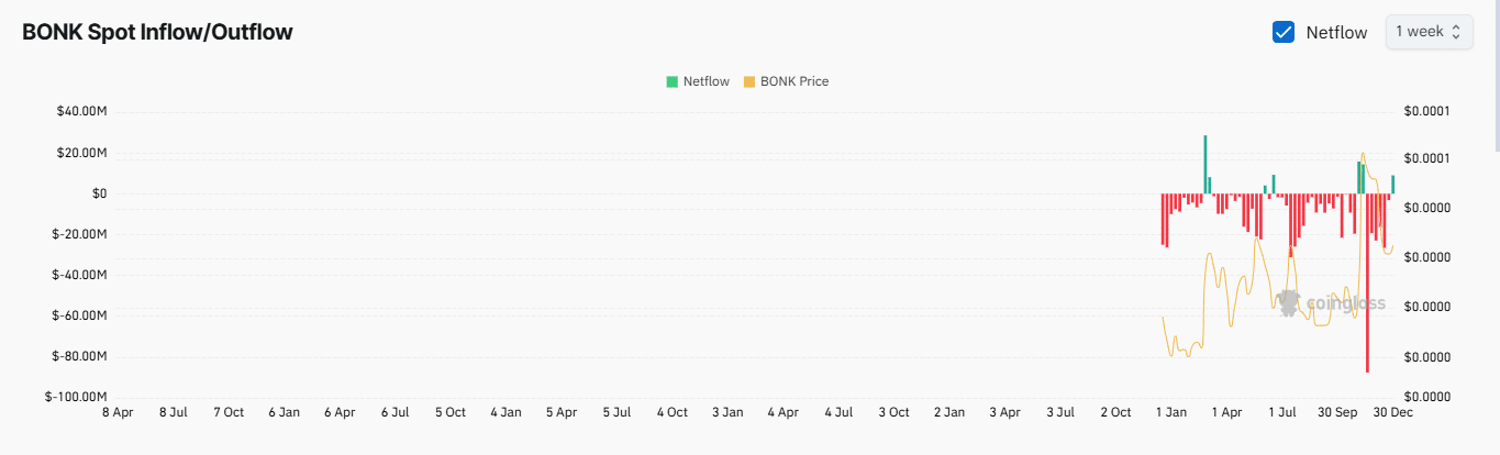 Additionally, Exchange Netflow data indicates unfavorable trends for BONK. There has been a significant inflow of funds into exchanges, totaling $7.85 million in the past week.