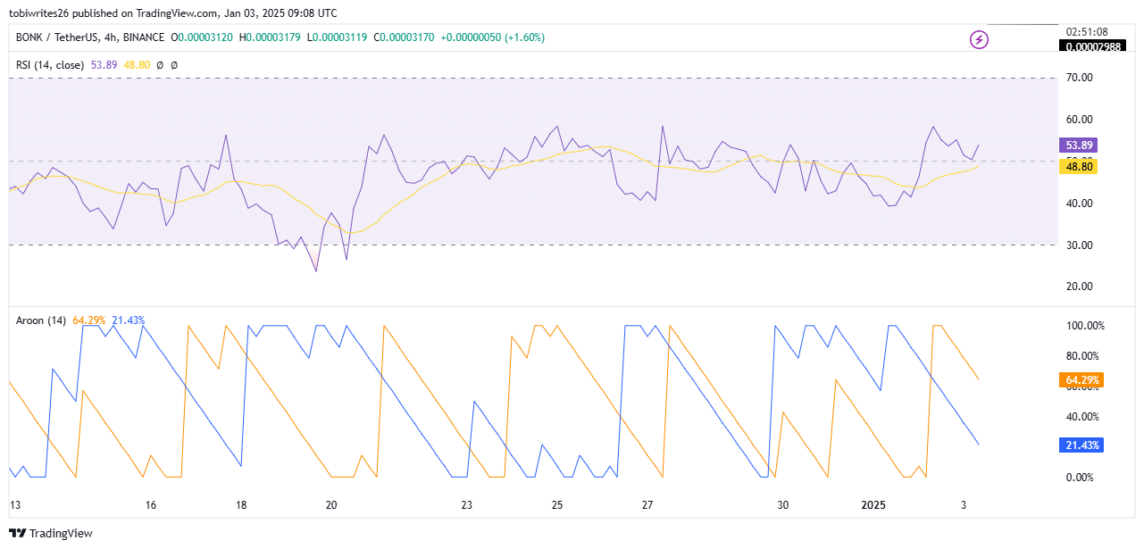 The Aroon indicator further confirms bullish momentum. The Aroon-Up (orange) is at 64.29%, outpacing the Aroon-Down (blue) at 21.43%. This indicates strong buying activity and suggests that BONK remains in an accumulation phase.