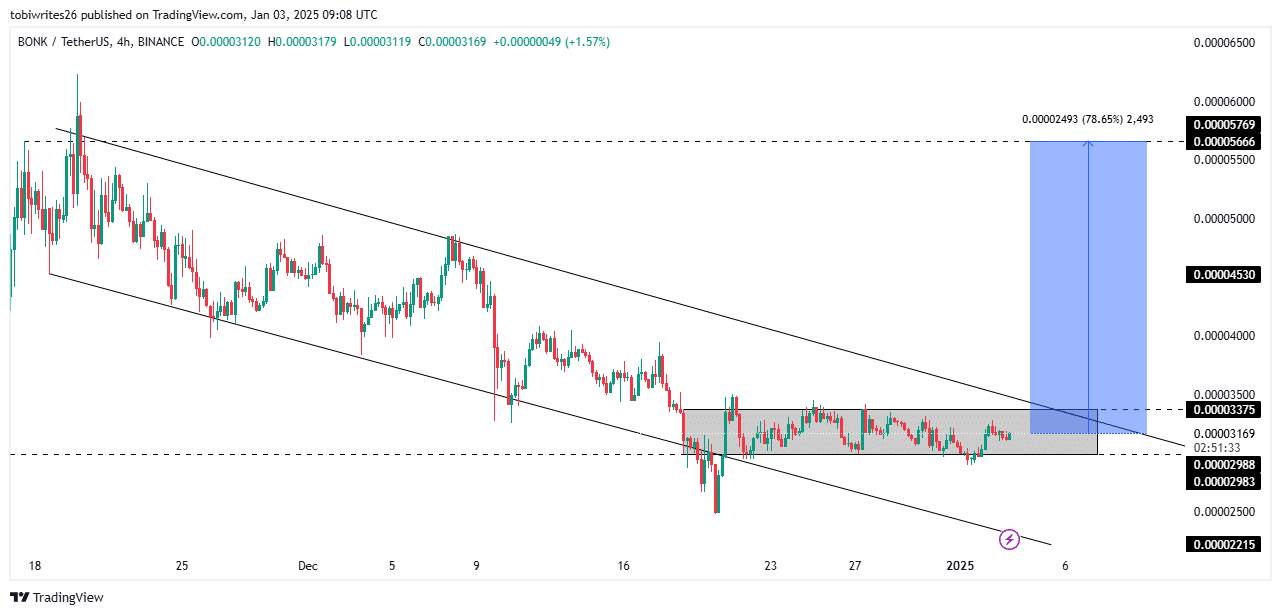 At press time, BONK was trading within two bullish patterns: a larger descending channel and a consolidation phase within the channel, showing ongoing accumulation.