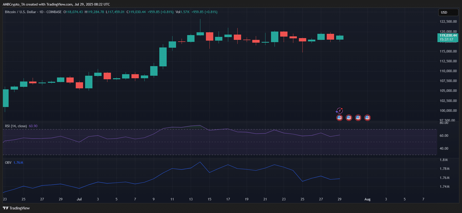 Bitcoin [BTC], however, remained relatively stable. At press time, it hovered near $119,000, with its daily RSI at 60.9; suggesting neutral momentum. The OBV showed no significant uptick, reinforcing a sideways trend.