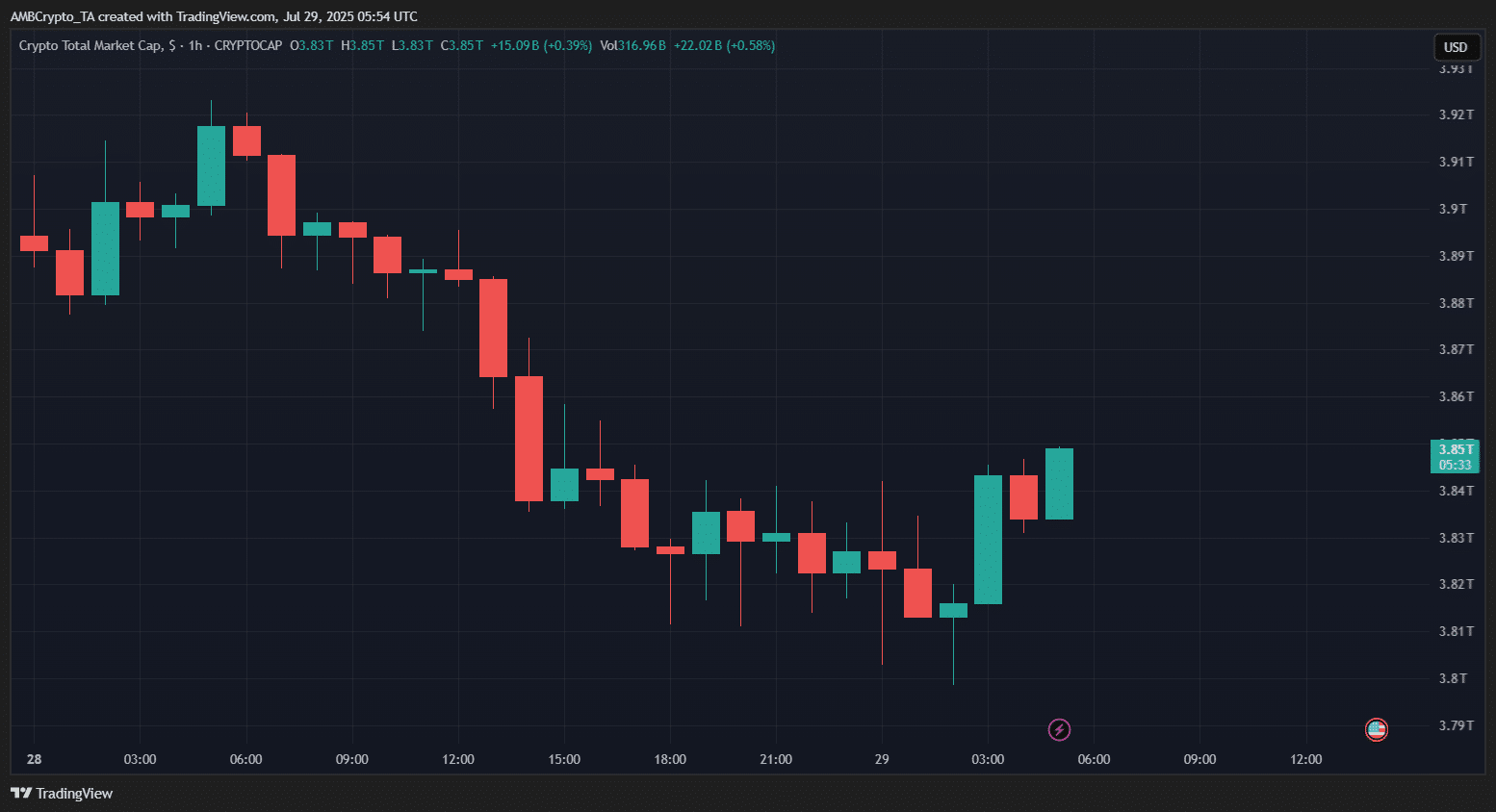 While the market showed signs of recovery around the $3.85 trillion level, overall momentum remained fragile.