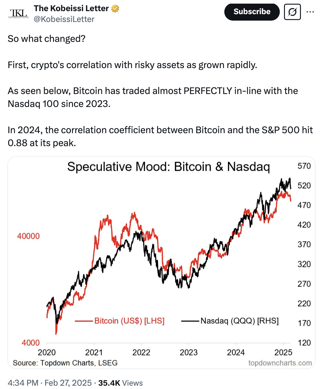 “For 10+ years, Bitcoin was viewed as a decentralized hedge against uncertainty, but something changed,” said capital markets commentator The Kobeissi Letter in a series of X posts on Feb. 27.