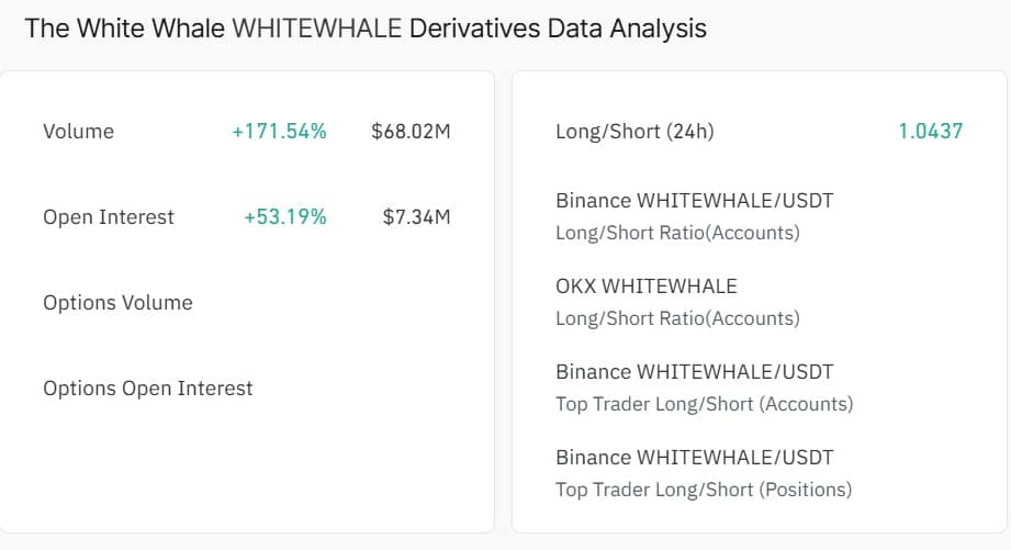 CoinGlass data showed Derivatives Volume jumping 171.54% to $68.02 million. Open Interest rose 53.19% to $7.34 million.
