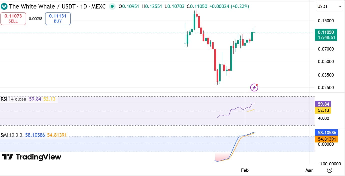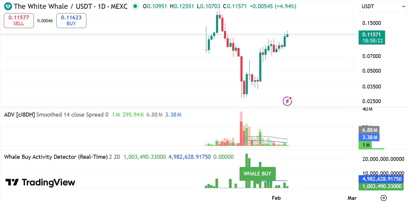 The White Whale [WHITEWHALE] crypto extended its price discovery despite broader market uncertainty. The memecoin defended the $0.10 level, surged to $0.125, then saw a modest pullback.
