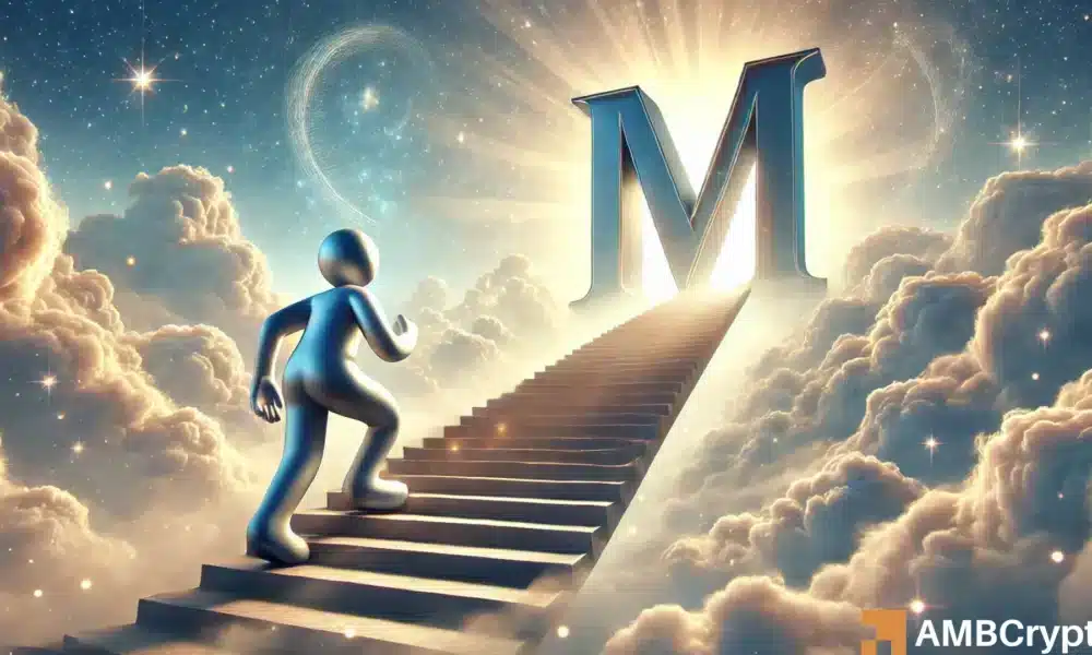MKR’s rally, while still bullish, could see a brief pause before continuing upward. Currently, the asset has broken through a descending resistance line pattern on the chart, hinting at a possible rally to the peak.