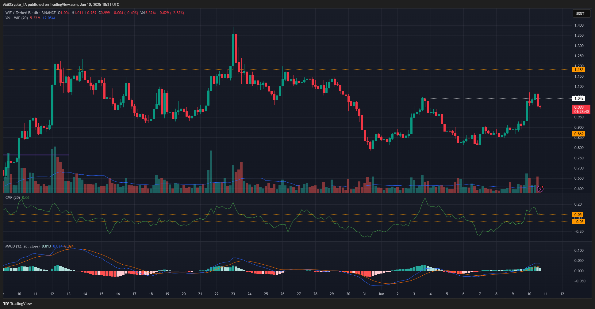 We had a brief dogwifhat price peek above the $1.04-level, followed by a bearish engulfing candle on the H4 chart – A sign of a bearish reversal. The CMF’s drop below +0.05 would be a clue that buying pressure has waned.