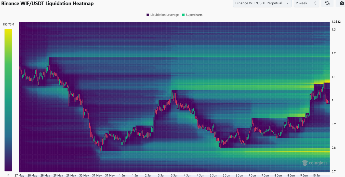 The 2-week liquidation heatmap showed two magnetic zones of importance. The one further from the market price was just below $0.8, the target of the anticipated bearish reversal. Another liquidity pocket at $1.08 could beckon WIF to it.