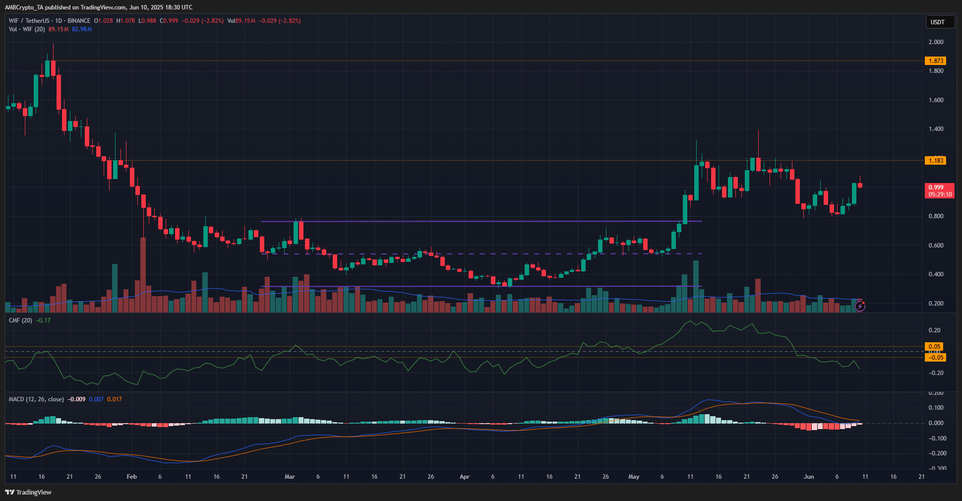 The 1-day chart signaled a bearish structure for dogwifhat. After testing the $1.18 resistance in mid-May, WIF set a higher low at $0.93 four days later, before bouncing higher to test $1.18 once again.