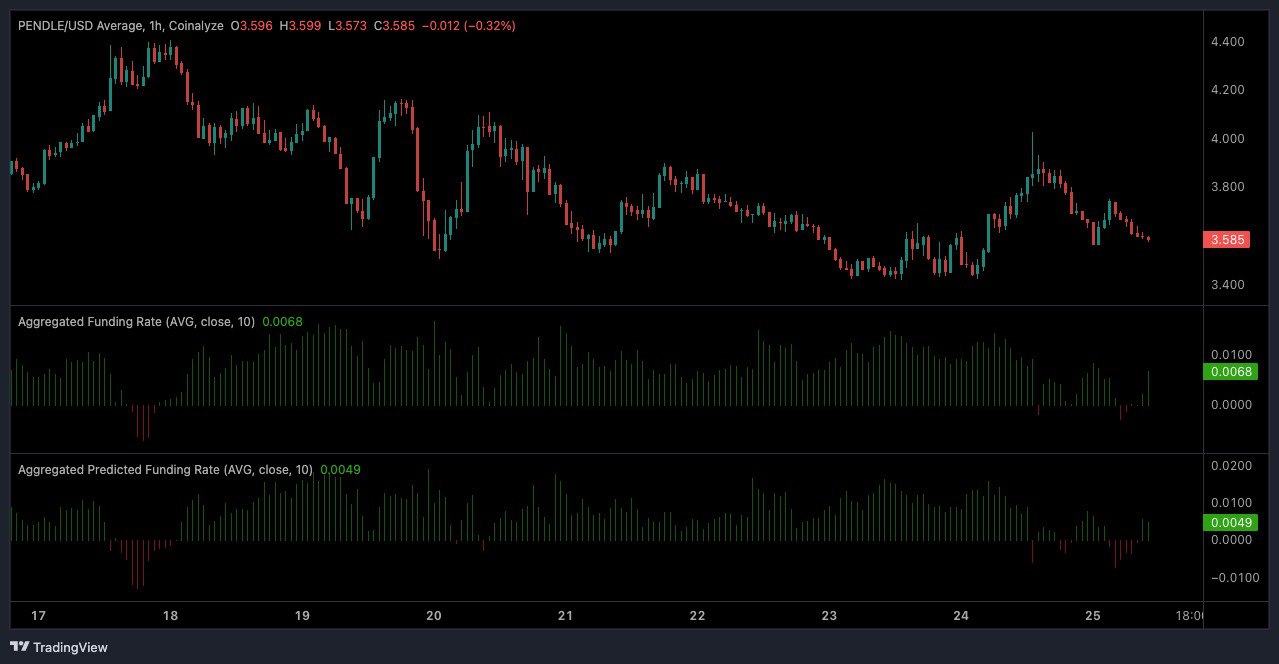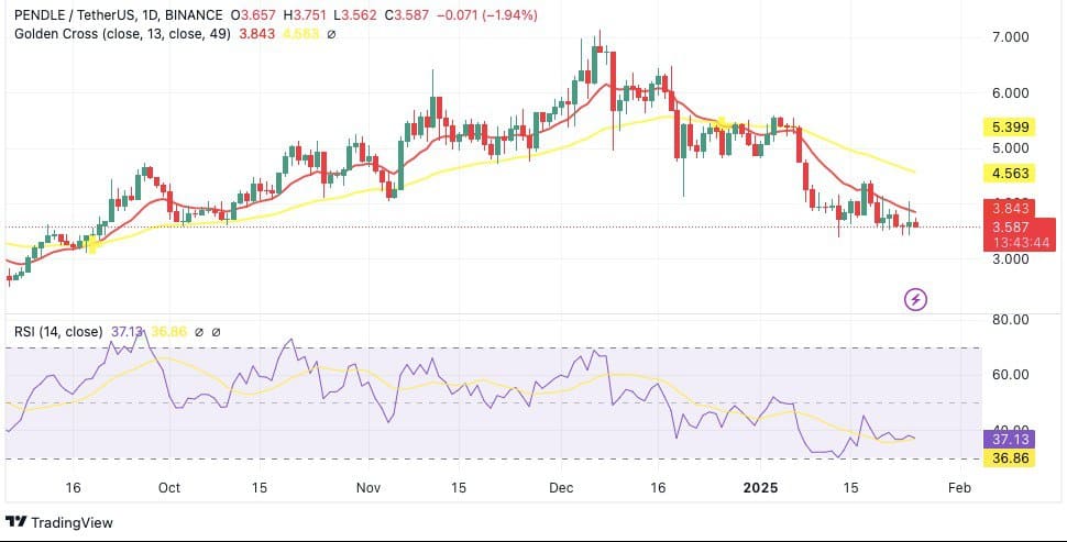Pendle’s daily chart reflected a bearish short-term trend, with the price trading below the 13-day EMA ($3.84) and the 49-day EMA ($4.56).