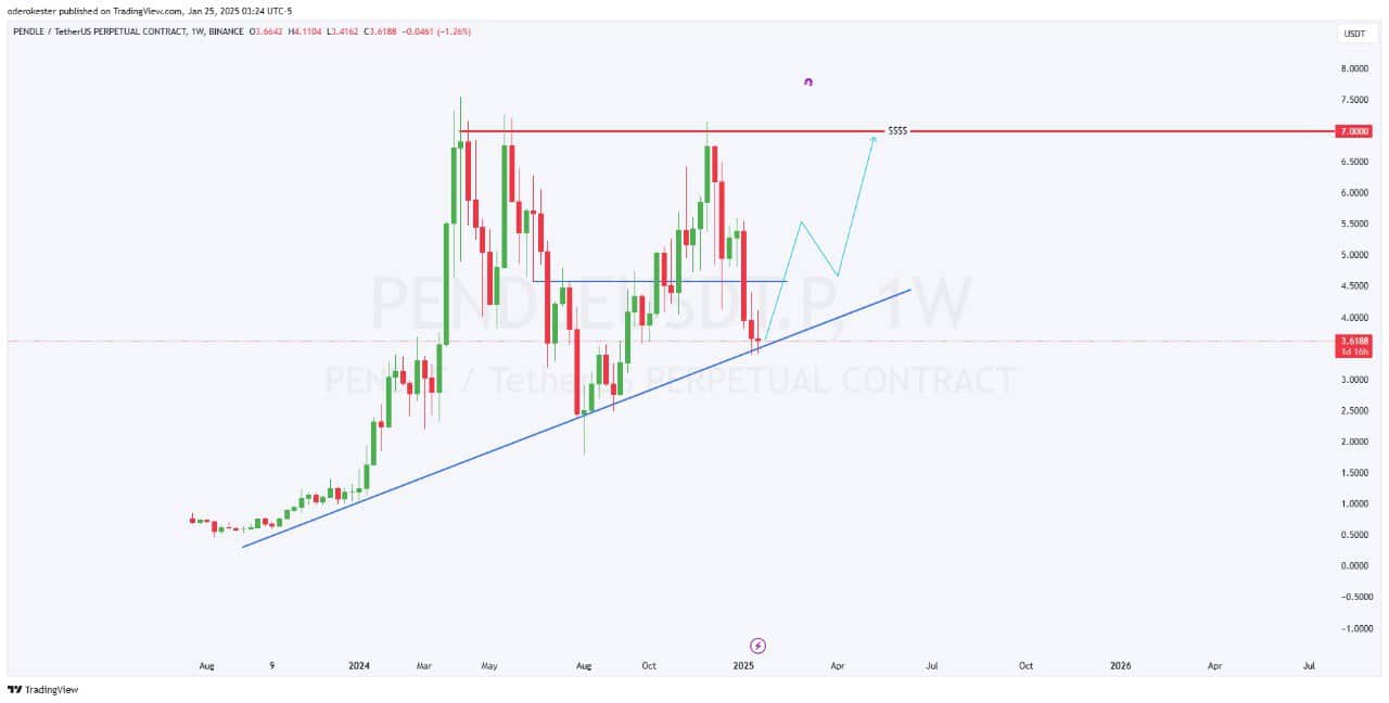 Pendle’s price was trading at $3.59 at press time, with a long-term ascending trendline providing strong technical support, at the time of writing.