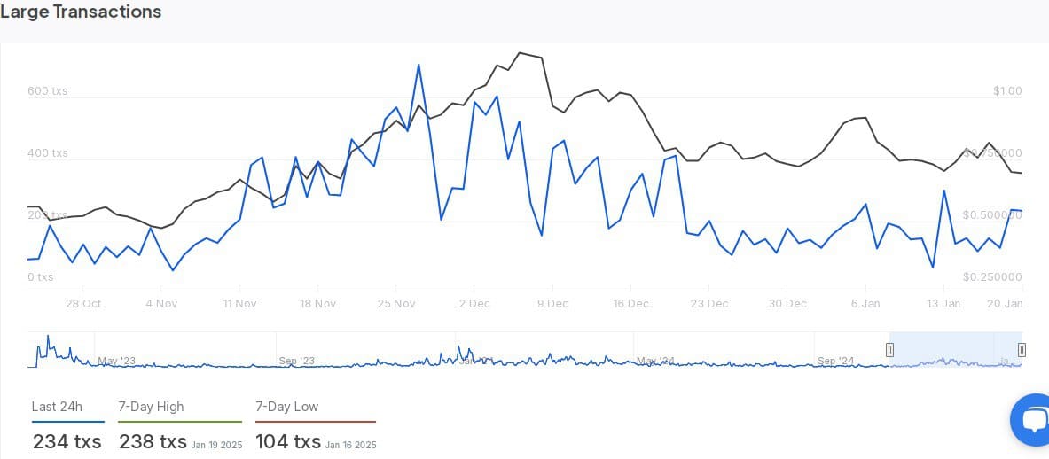 Large transaction activity remains subdued, with 234 transactions in the past 24 hours, down from a 7-day high of 238.