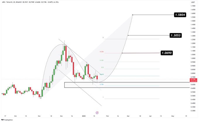Rose Premium Signals projects upside targets at $1.0690, $1.3053, and $1.5804, provided ARB can break above the trendline.